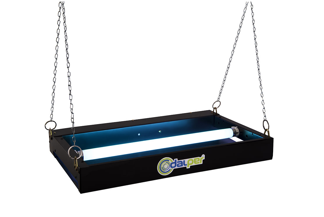 Uma Armadilha Luminosa para Moscas Slim 15 Dalper - BIVOLT 127/220. O equipamento possui uma lâmpada fluorescente UV-A de 15watts e acompanha um refil adesivo grande (45cm x 22 cm).